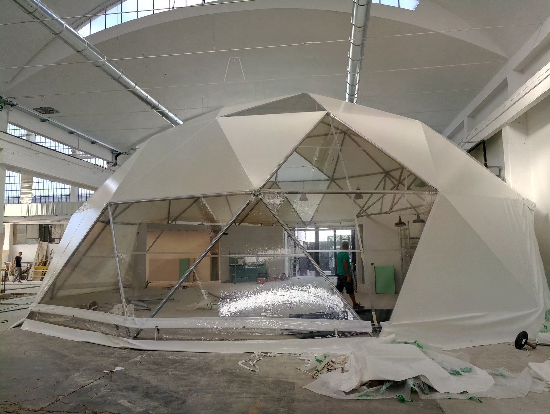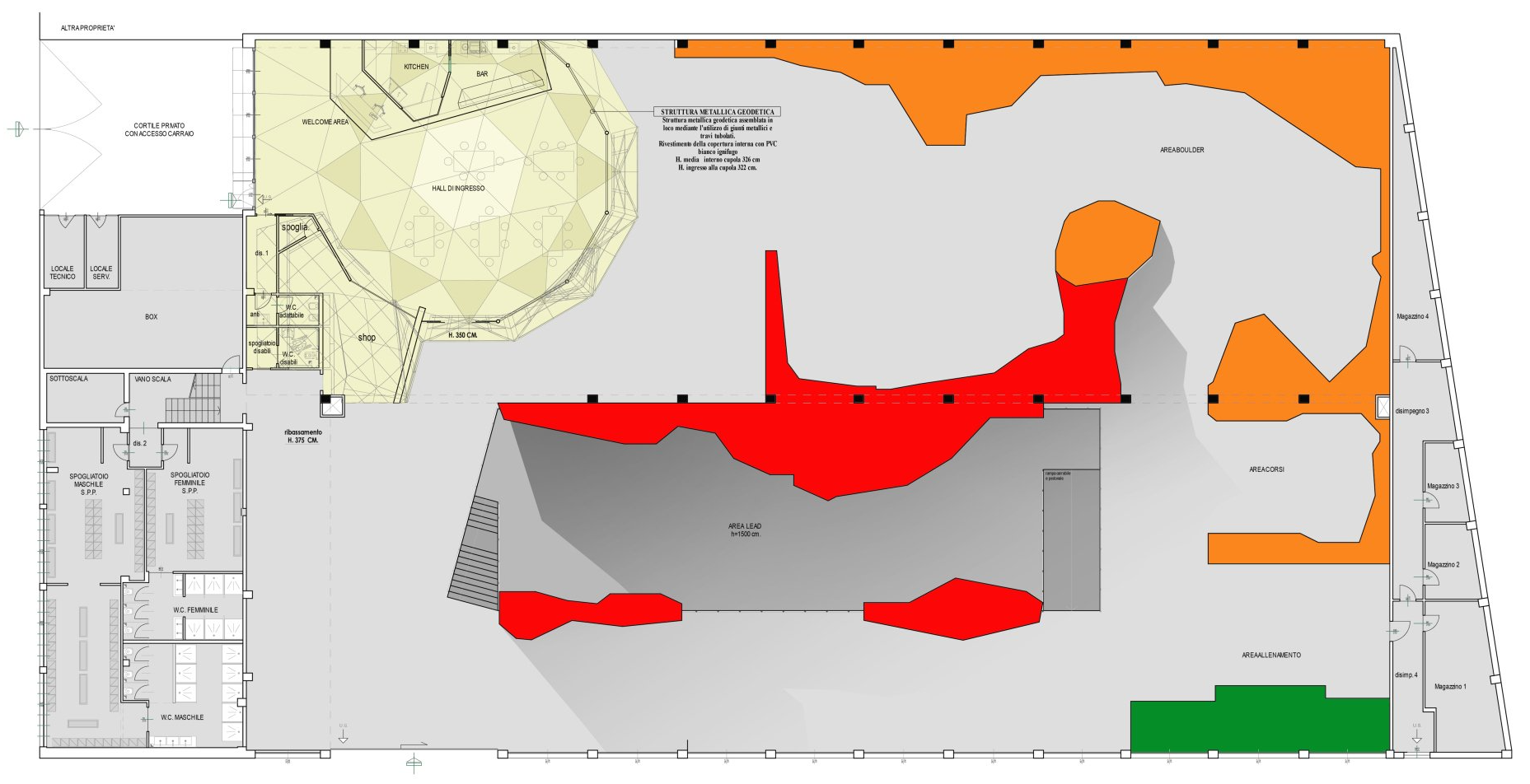 Le molteplici fasi di progettazione coordinate attraverso la stesura preliminare di un Master Plan hanno interessato gli aspetti tecnici/funzionali ed estetici/architettonici ; welcome area, corner shop, area break , servizi annessi , spogliatoi, servizi igienici , locali tecnici, aree climbing e aree boulder, aree didattiche ed uffici. La necessita' di differenziare lla superficie dell' area industriale iniziale in sotto- aree con diversi utilizzi e con necessita' di temperature del microclima interno differenti e' stata la motivazione di spingere l' idea progettuale verso soluzioni innovative.Mediante la realizzazione della cupola tipo "geodetica" che racchiude le funzioni di hospitality si e' riusciti ha soffisfare le necessita' iniziali e nel contempo si e' evocato lo scenario tipico della montagna antropizzata simulando le caratteristiche estetiche della tenda a cupola alpinistica, intorno alla quale le pareti di arrampicata hanno composto lo scenario ideale per il climber.